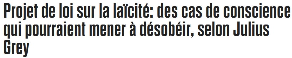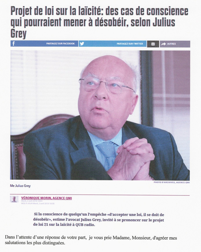 Me Julius Grey figure de loi, avocat au Barreau du Québec à tout simplement suggérer et inciter ceux ou celles qui ne sont pas en encore la loi sur la laïcité, de ne pas la respecter, que selon lui : si la conscience de quelqu’un l’empêche «d'accepter une loi, il se doit de désobéir».