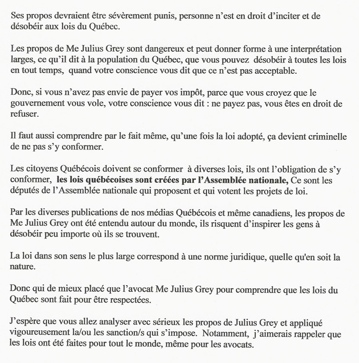 Je pense que les paroles de Me Julius Grey sont d'une gravité extrême, il doit être puni et en répondre devant Le Barreau du Québec. N'oubliez pas qu'un avocat doit selon le code déontologique :