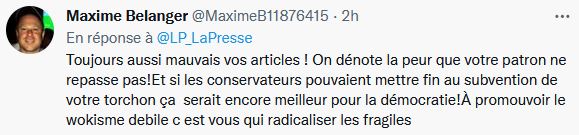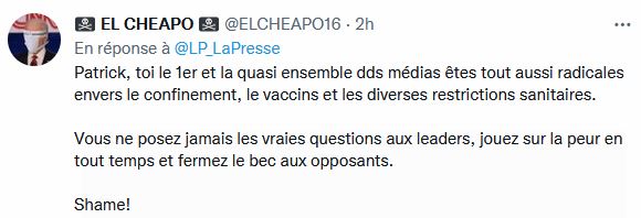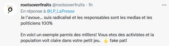 «Patrick devrait relire le code éthique du journalisme, La Presse aussi, Lagacé toujours aussi méprisant et condescendant, désinformation, Inondons La Presse de plaintes pour manque d’éthique journalistique, a quoi sert Patrick lagacé, a un sérieux problème là! Il est complètement incohérent , discours haineux, langues brunes du Québec, Patrick Lagaçé, quand un hystérique est dans sa phase extrême de délire, quand est-ce qu'on arrête Jean Charest Guy Ouellet et Patrick Lagacé ?