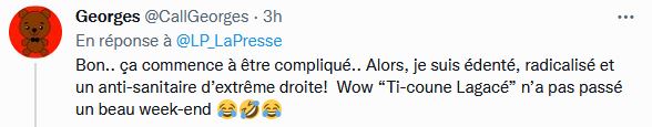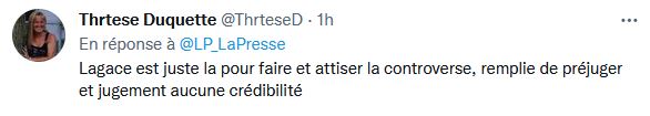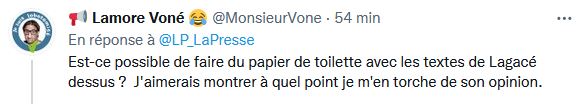 Quand on fait une recherche sur son nom à la page même, dans le champ recherche Twitter, on peut se rendre compte que M. Lagacé est détesté, il est clair que les commentaires sont très disgracieux, «mais pour ceux qui connaissent Lagacé savent quand c'est le temps de chier sur la peuple il le fait dans les règles de l'art, il le dénigre sans gêne».
