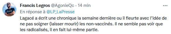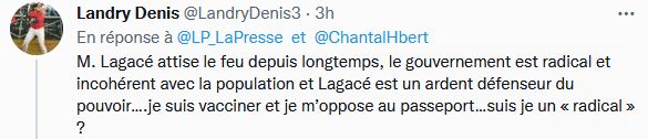Patrick Lagacé absolument pas honnête, il utilise le nouveau mot que les médias de propagande ont trouvé pour vous dénigré "anti-sanitaire, anti-vax" parce que ceux qui ne sont pas vaccinés, sont considérés dangereux, radicalisé, il faut se poser la question, au troisième vaccin, est-ce que ceux qui vont avoir deux vaccins seront dangereux pour ceux qui en ont eu trois, ainsi de suite.