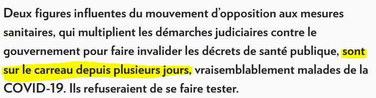 Bien sûr, j'ai dû lire cet article, «misère!» «Pour le premier paragraphe en gras, déjà ça fonctionne pas!» deux figures influentes du mouvement d’opposition aux mesures sanitaires,, sur le carreau depuis plusieurs jours blab bla..