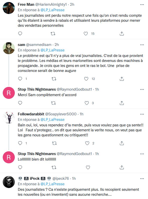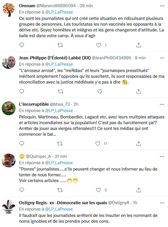 Est-ce que ce sont les mêmes journalistes qui traitent les gens d'édentés, complotistes, covidiots, touristata, anti-masques, anti-vax, récalcitrants, égocentriques, irresponsables, négationnistes, terroristes, fêlés, coucous, sous-éduqués, extrémistes, racistes, dangereux, bozos, crétins, tatas, danger public, égoïste et beaucoup d'autres qualificatifs du genre qui se plaignent? Les journalistes insultent et encouragent la haine envers ceux qui ne pensent pas comme eux depuis janvier 2019.