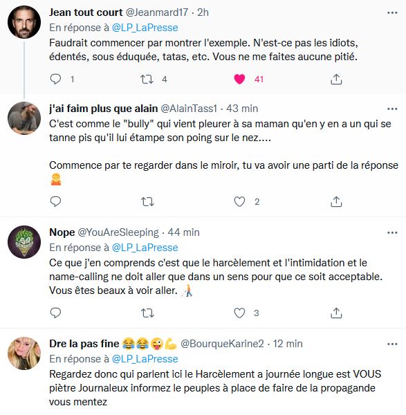Les pauvres victimes, là, j'ai failli presque tombé en bas de ma chaise, les journalistes à la langue brune, les quéteux de subventions se plaignent d'être mal traités sur les réseaux sociaux, pourquoi donc! la est la question : C'est Mayssa Ferah de La Presse de Montréal qui signe un article intitulé : Front commun contre le harcèlement en ligne envers les journalistes.