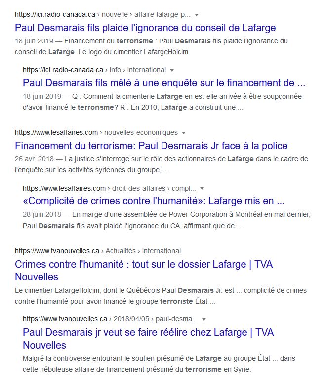 2018: Administrateur de LafargeHolcim, Paul Desmarais, jr, se retrouve sur la sellette, puisque l’entreprise est soupçonnée d’avoir participé au financement de groupes terroristes pour qu’ils permettent le maintien des activités d’une usine de ciment en Syrie.