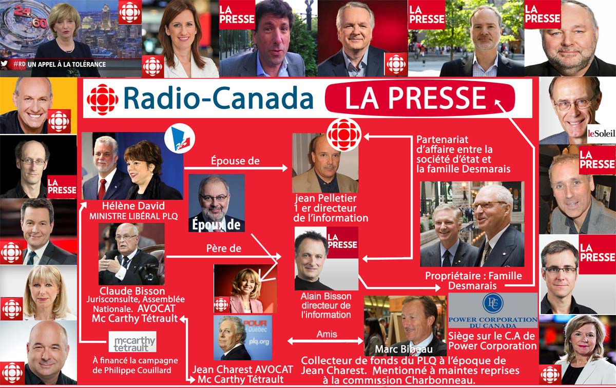 Hélène David Ministre du parti libéral du Québec est l'épouse de Jean Pelletier 1 er directeur de l'information de Radio-Canada, donc la soeur de Françoise David de Québec solidaire. Pierre Arcand ministre libéral est le mari de Dominique Chaloult qui est directrice générale à Radio-Canada.