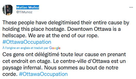 These people have delegitimised their entire cause by holding this place hostage. Downtown Ottawa is a hellscape. We are at the end of our rope. #OttawaOccupation pic.twitter.com/s2DmlUodBd