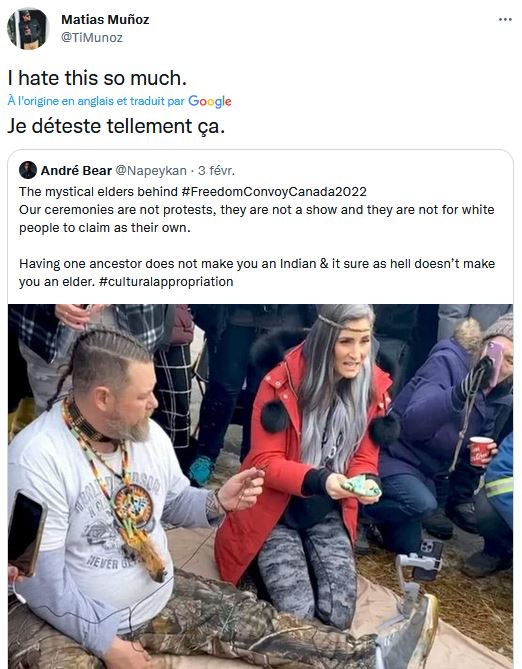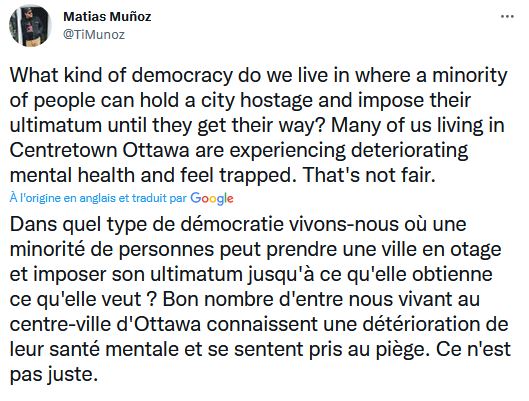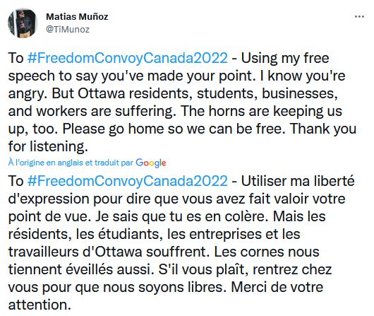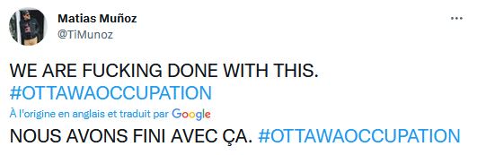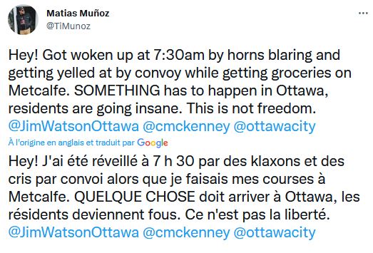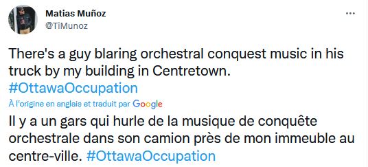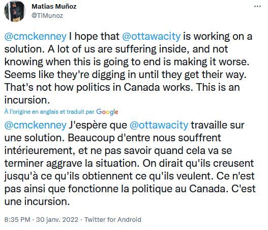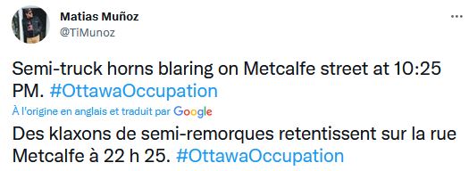 Dans un autre poste sur Twitter il avait dit cela, mais il là, effacé : «Des pierres ont été lancées sur une ambulance d'Ottawa et des insultes raciales à l'ambulancier paramédical depuis un camion qui faisait partie du convoi de protestation, selon le Service paramédic d'Ottawa»
