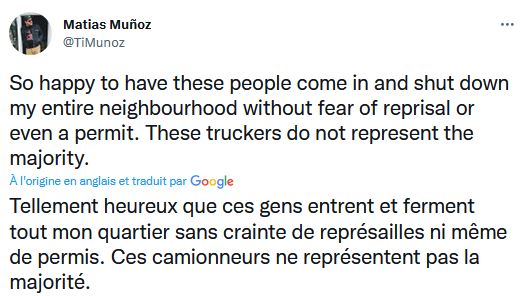 Matias Monuz, lives very close to the Convoy, he is obsessed with truckers, they watch them and film through his window, they hate them, they are parked in front of his house, and finally several say on Twitter that he is from the antifa movement terrorists.
