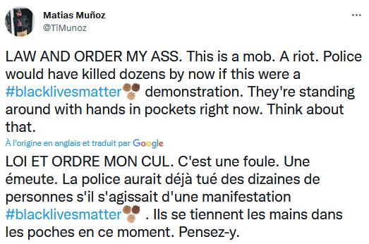Gageons que ce cher Mathias se cherchent des entrer dans le monde politique. Voici ses nombreux postes sur Twitter à propos des manifestants.