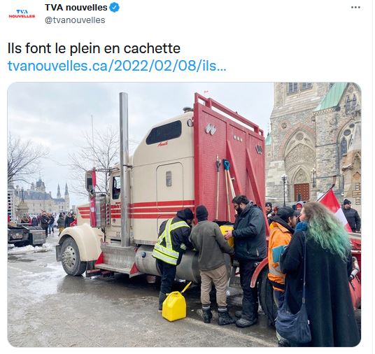 Pour cette fausse nouvelle, comme toutes les fausses nouvelles, TVA ne dit pas que les policiers qui avaient saisi le carburants, ont été obliger de la remettre, car ils avaient contrevenus à la charte des droits et liberté canadienne. Personne ne se cache ils le font en plein jour et l'essence, (dans ce cas-ci à été apporté par les citoyen d'Ottawa qui appuient le mouvement et étaient en désacort avec la saisi.