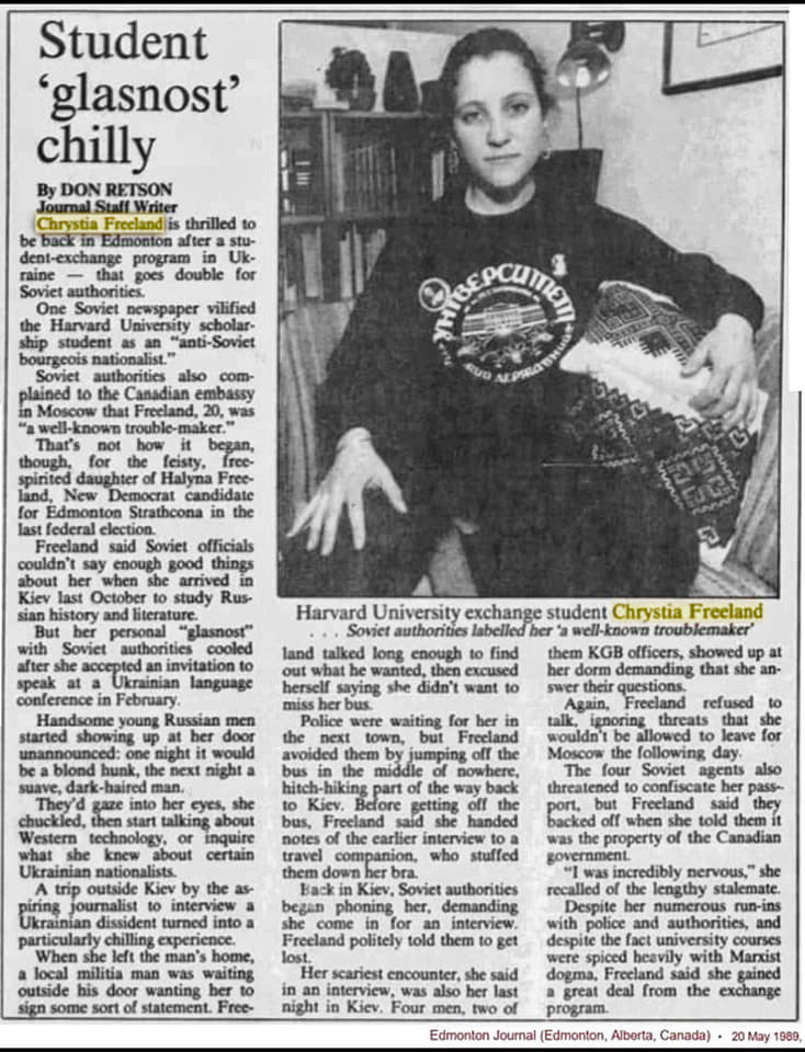 Pour Mme Freeland à été reconnue par le KGB comme une personne à problème dans dans sa jeunesse lors de sa présence en Ukraine lorsqu’elle était étudiante.