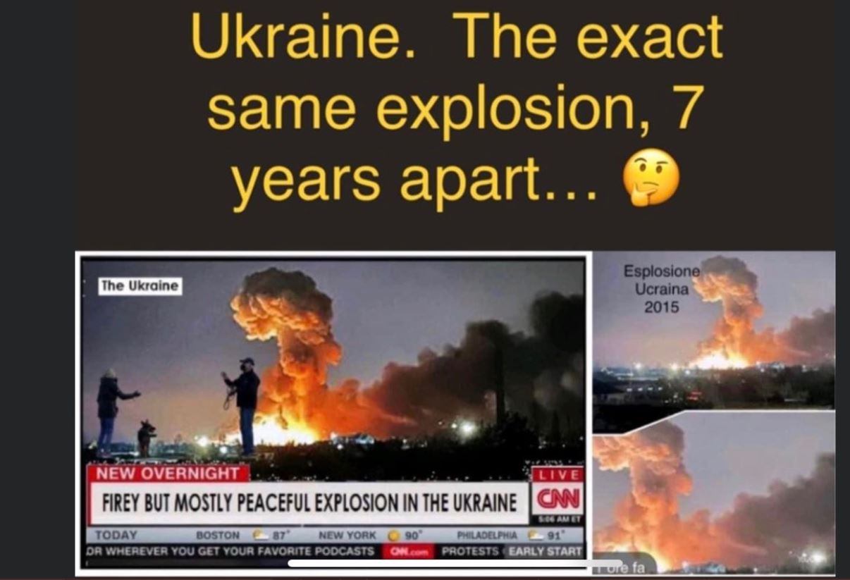 Cette photo tirée d'un incident qui s'est produit, supposément une fuite de gaz en 2018, fait maintenant les manchettes dans le média du Canada, mais partout dans le monde en rapport avec la guerre. Il est simple de savoir quels sont les médias qui désinforment, il s'agit de faire rapidement une recherche avec Google images pour se rendre compte que cette photo à fait son apparition sur le net bien avant que la guerre débute.