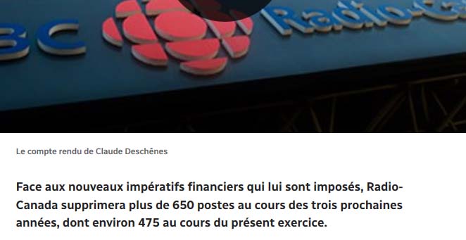 Peu importe les millions injectés en 2016, 2017,2018 dans Radio-Canada, il y a toujours de nombreuses coupures de postes. Il ne passe pas une journée ou presque sans que l'on parle de voile, de musulmans à Radio-Canada, sa vache à lait, c'est sans nul doute Justin Trudeau. J'ai entendu dire entre les branches, que Radio-Canada est très très politisé côté libéraux, ça devient même très lourd pour certains employés.