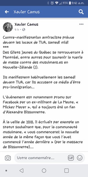 Ceux-ci ont répondu au message lancé sur Facebook par le professeur Xavier Camus, il a prétendu que la manifestation était en fait, un acte de racisme en réponse à la tuerie de la Nouvelle-Zélande.