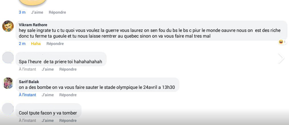 Peu de temps après la manifestation des musulmans du 7 avril dans le centre-ville de Montréal contre le projet de loi sur la laïcité du Gouvernement de la CAQ, des menaces terroristes ont été proférées sur le réseau social Facebook par deux hommes sur la page " la vague bleu" des messages de menaces sont apparus en relation d'une publication qui mentionnait qu'une manifestation devait avoir lieu le 4 mai devant TVA Nouvelles.