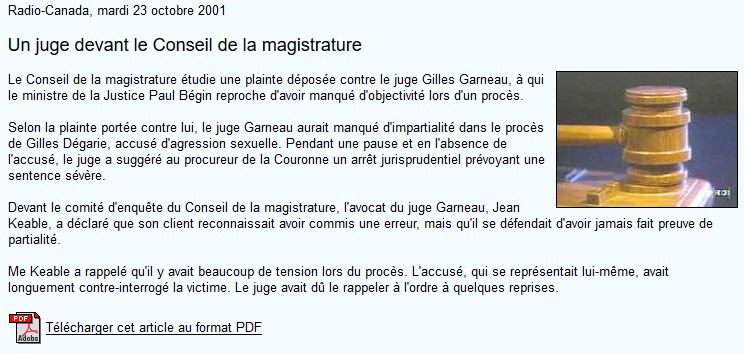Les médias qui publient des articles sur le juge Garneau en octobre 2001, n'est-ce pas dans la normale des choses de faire un lien, souligner les fautes du juge qui a été reconnu coupable dans l'article sur Pierre Dion ?