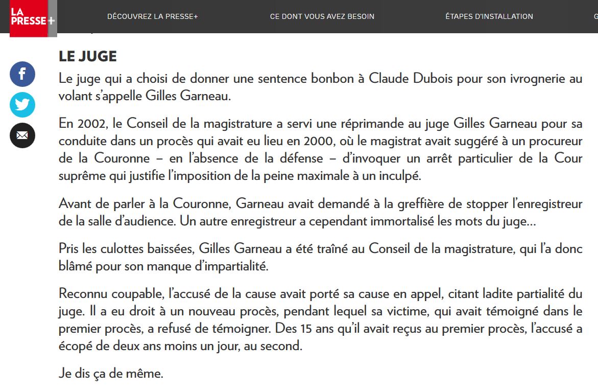 Aucun média ne semble mettre en doute la partialité du juge pour ce qui est de la cause de Pierre Dion, pourtant, quand l'on traine ce genre de réputation, honnêtement la première chose à celle, je pense, qui me vient à l'esprit, c'est le doute sur partialité du Juge Garneau.