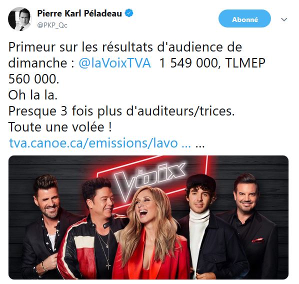 Oh la, la, toute une volée ! comme dit si bien Pierre Karl Péladeau dans une publication sur Twitter, c'est à croire que l'émission Tout le monde en parle VS La Voix, perd des plumes! les cotes d'écoute de TVA ont presque triplé, plus d'auditeurs/trices, c'est pas moins de 1 549 000 audiences contre 560 000 pour TLMEP.