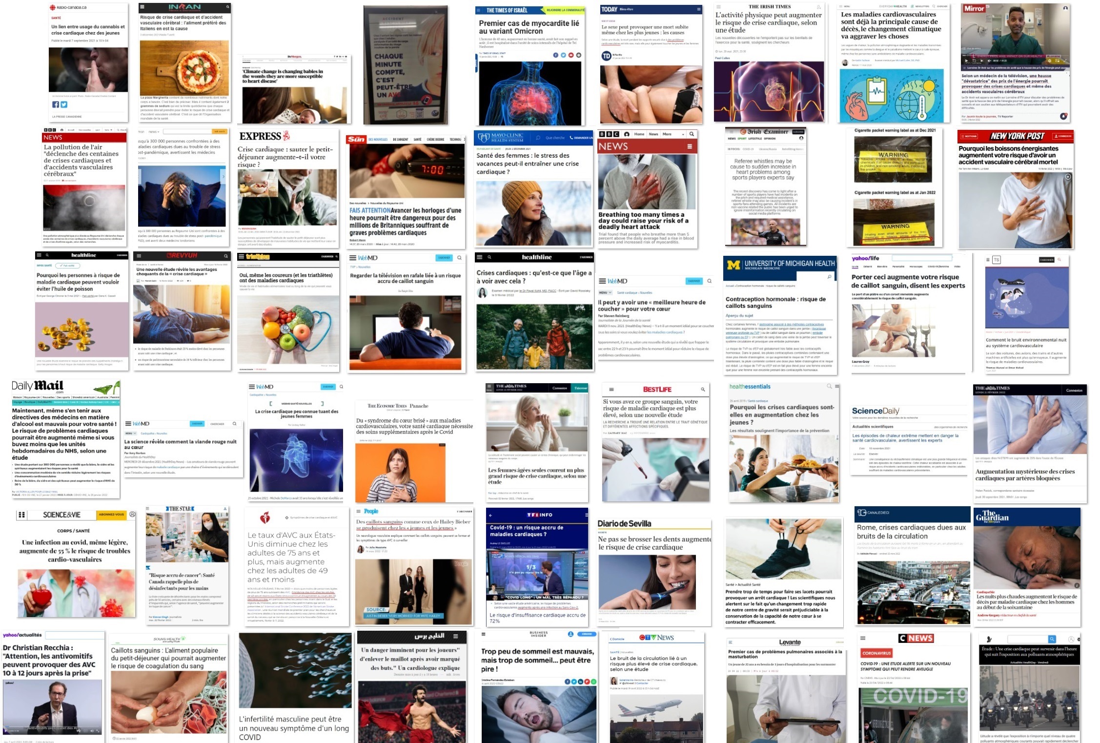 Le Canabis, manger italien, le climat, le variant Omicro, le sexe, l'activité physique, sport, le prix de l'énergie, la pollution, trouble de stress, petit déjeuné, avancer l'heure, les vacances, respirer à plusieurs reprises, la cigarette, les boissons énergisantes, huile de poisson, regarder la télévision risque de caillots, heure de coucher, la contraception hormonale (caillot sanguin), avoir un plâtre, le bruit, alcool, viande rouge, les jeunes femmes, votre santé cardiovasculaire nécessite des soins de santé après la Covid, les femmes âgées seules, votre groupe sanguin, les jeunes, chaleur extrême, augmentation mystérieuse des crises cardiaques par artères bloquées, infection au Covid, caillot sanguin chez les jeunes, ne pas se brosser les dents, attacher ses lacets, bruits de circulation, les nuits chaudes, antivomitif, les oeufs, pour les sportifs(enlever son maillot après avoir compter un but), trop peu de sommeil ou trop, covid peut rendre aveugle, etc.