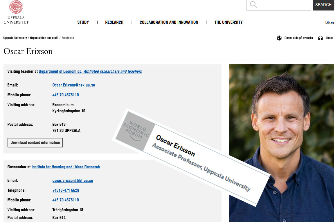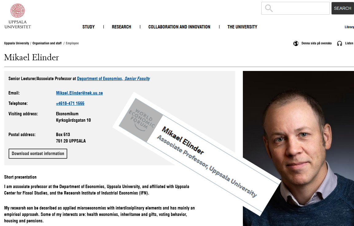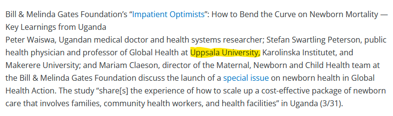 J'ai été faire quelques recherches sur l'université d'Uppsala, sachez que j'ai trouvé deux noms associés au Forum Économique Mondial (il y en a surement +++ plus, trop de pages à vérifié) et sachez également que la Fondation Melinda & Gates la subventionne plus de 33000 organismes, universités, hôpitaux, etc.